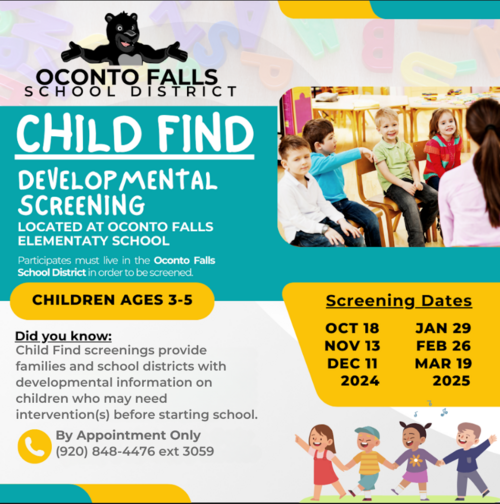 If you are a parent in the Oconto Falls School District who has concerns about your child's developmental progress, schedule a Child Find screening tod...