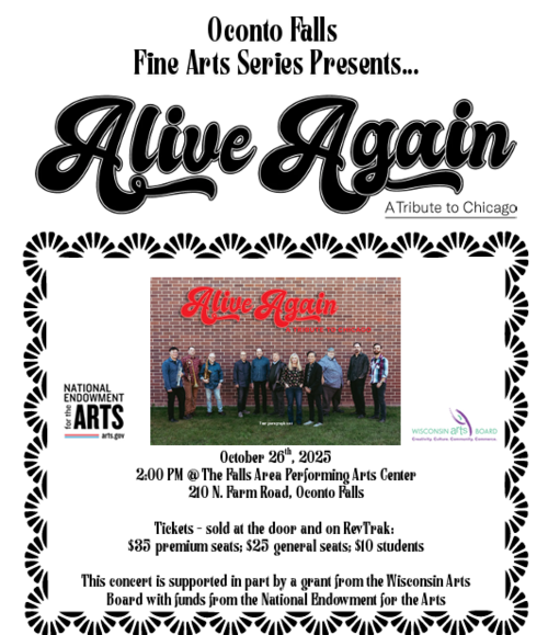 Oconto Falls Fine Arts Series presents . . . Alive Again - A Tribute to Chicago on October 26th at 2:00 PM - Falls Area Performing Arts Center (OFHS PAC). Get y...